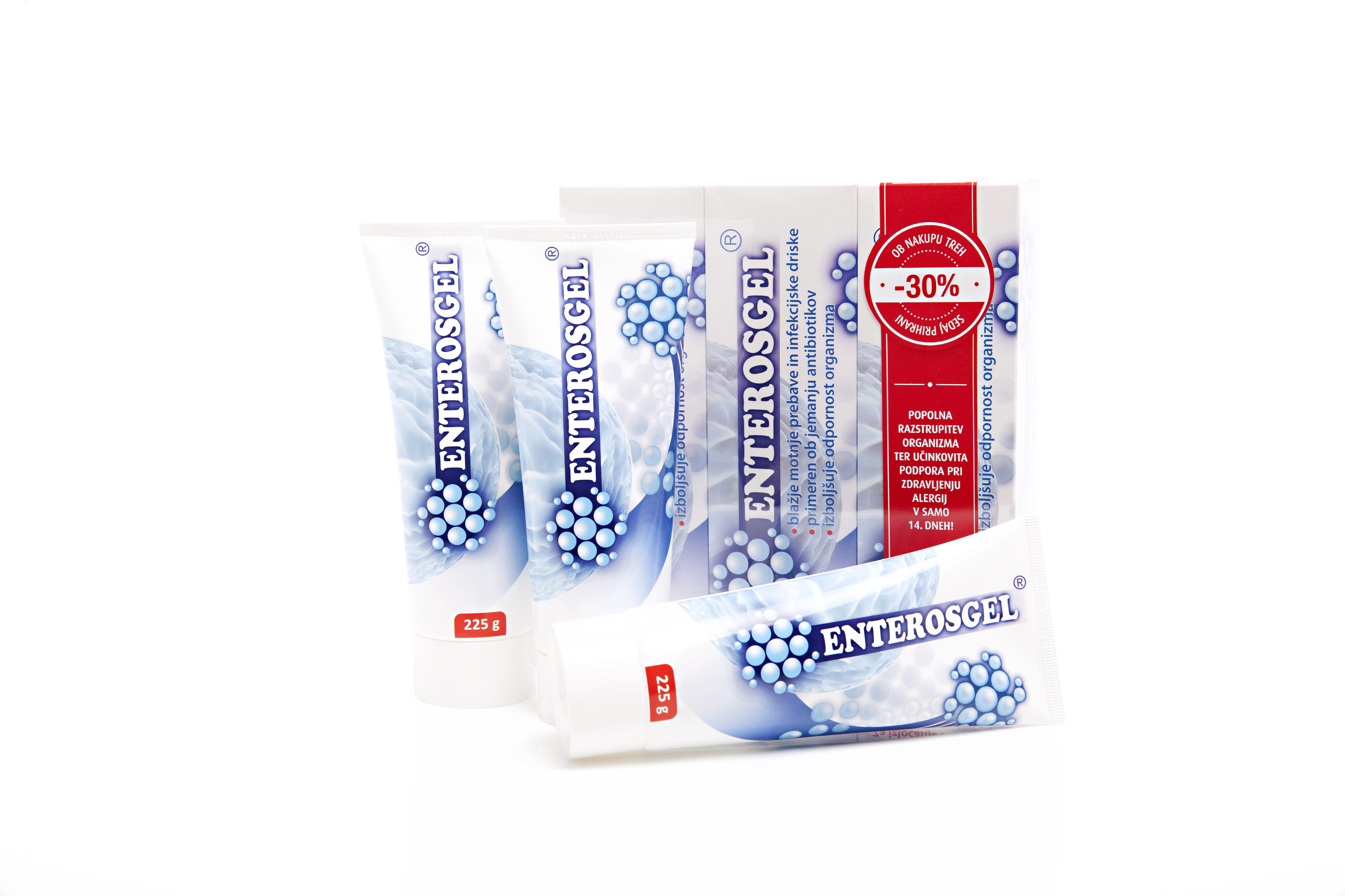 Paket je sestavljen iz dveh Enterosgel trojčkov in vsebuje 6 posameznih 225g Enterosgel tub. Količina paketa je namenjena 14-dnevnemu razstrupljanju dveh odraslih oseb (oz. 1 mesečnemu razstrupljanju odrasle osebe).